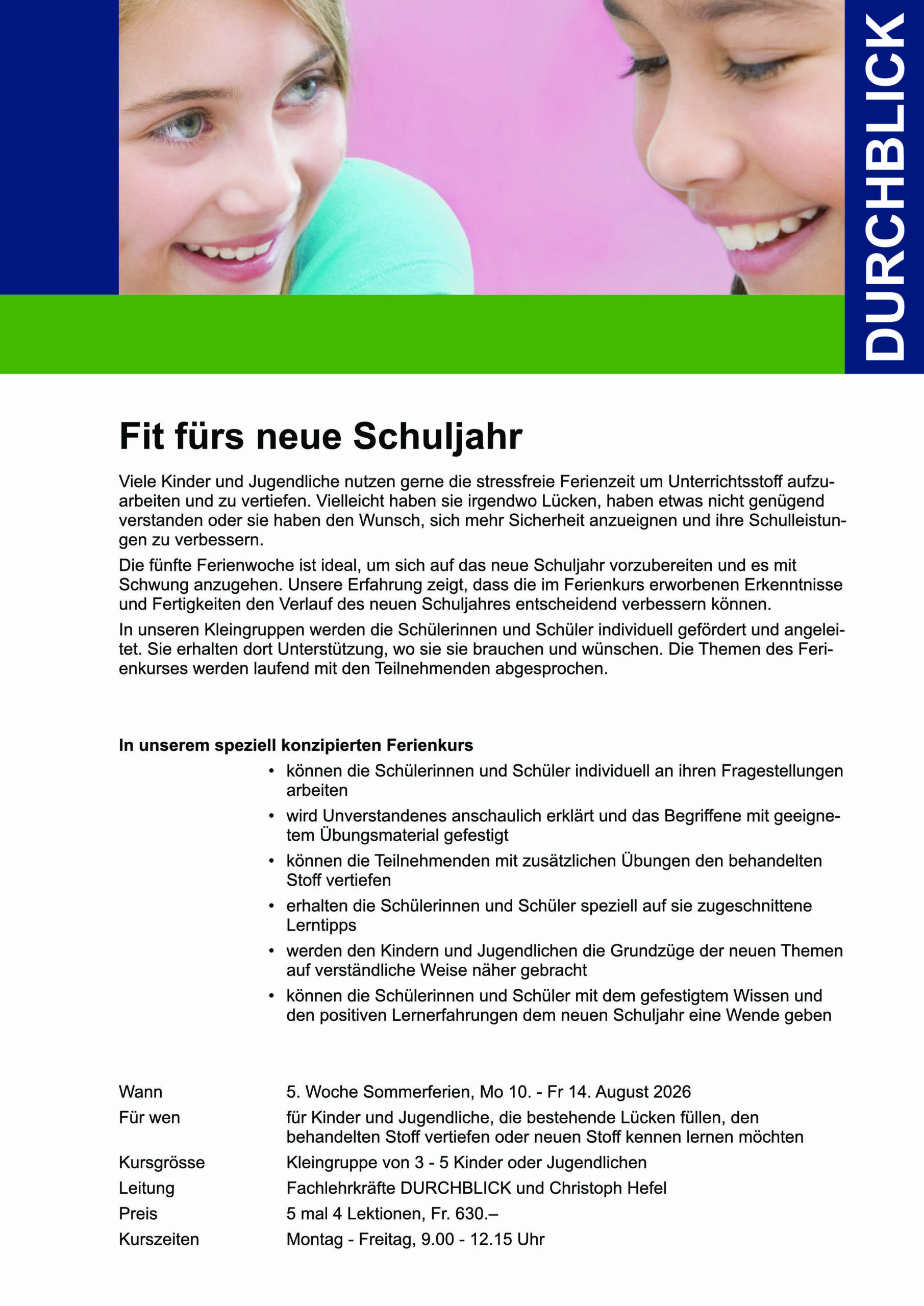 Die fünfte Ferienwoche ist ideal, um sich auf das neue Schuljahr vorzubereiten und es mit Schwung anzugehen. Unsere Erfahrung zeigt, dass die im Ferienkurs erworbenen Erkenntnisse und Fertigkeiten den Verlauf des neuen Schuljahres entscheidend verbessern können.