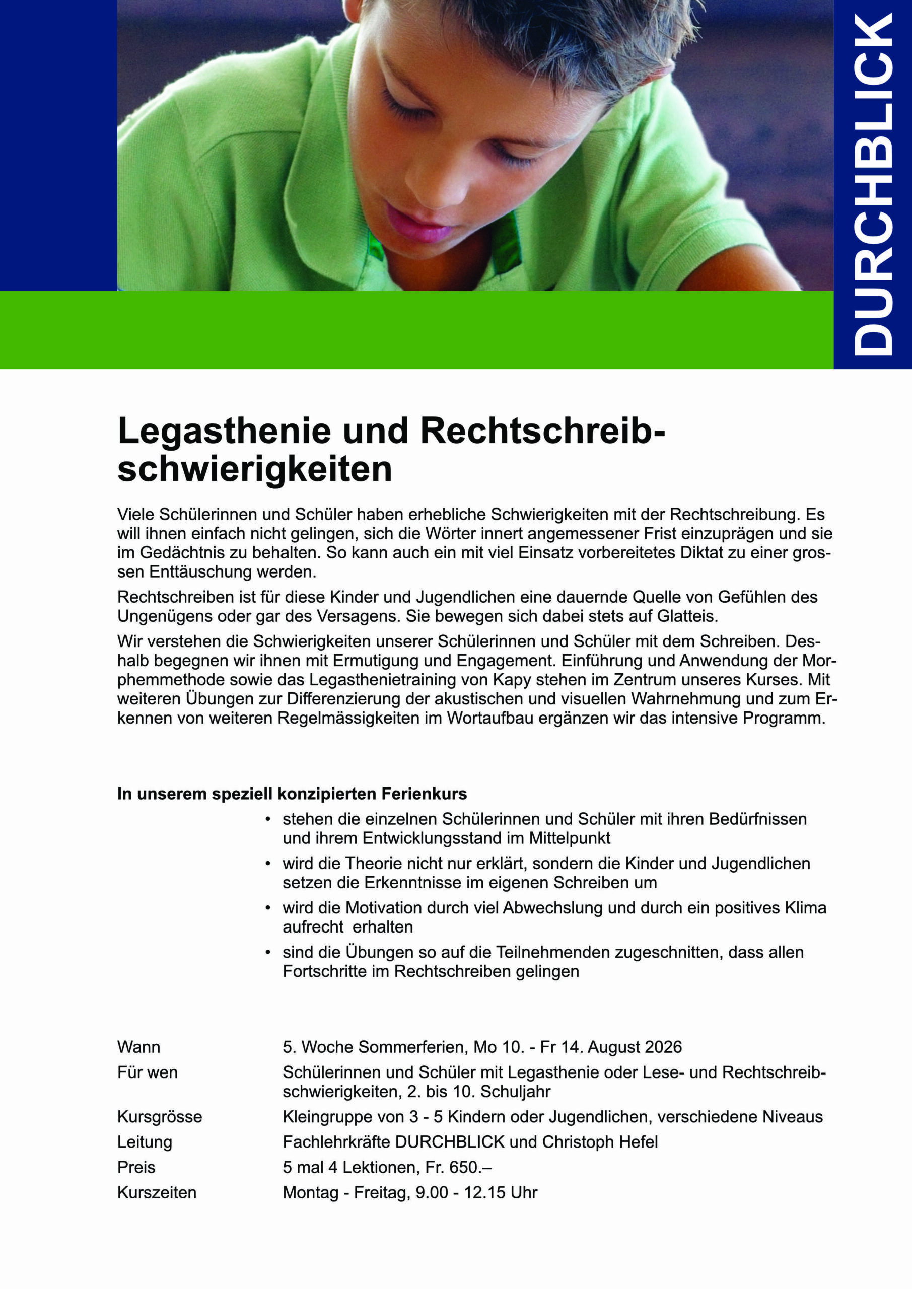 Wir verstehen die Schwierigkeiten unserer Schülerinnen und Schüler mit dem Schreiben. Deshalb begegnen wir ihnen mit Ermutigung und Engagement. Einführung und Anwendung der Morphemmethode sowie das Legasthenietraining von Kapy stehen im Zentrum unseres Kurses. Mit weiteren Übungen zur Differenzierung der akustischen und visuellen Wahrnehmung und zum Erkennen von weiteren Regelmässigkeiten im Wortaufbau ergänzen wir das intensive Programm.
